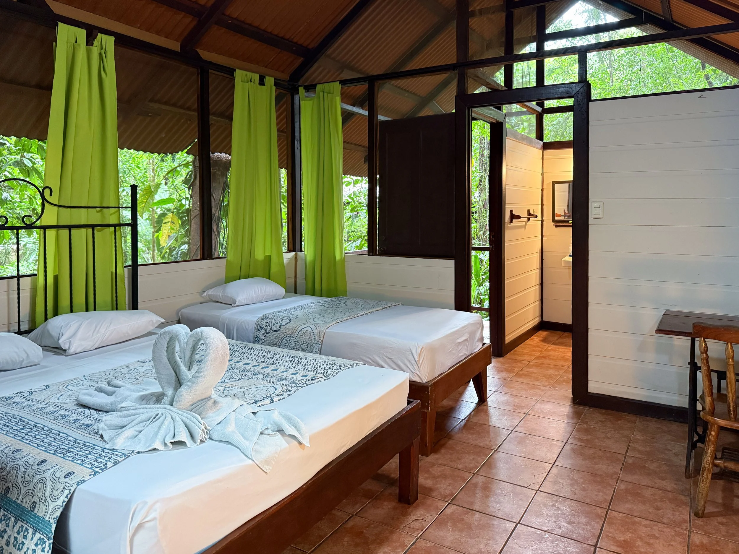 Inside, you’ll find the essentials: a comfortable bed, private bathroom with hot water, ceiling fan, and safety box. Outside, you’ll find the main attraction: monkeys leaping between branches, birds filling the canopy with sound, and the constant rhythm of the forest.